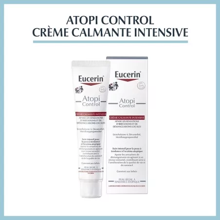 EUCERIN AtopiControl, Crème calmante intense. Complexe d’ingrédients actifs. Soin d’attaque. Aide à combattre l’intensité des poussées de sécheresse cutanée sévère. Convient aux nourissons. Peau à tendance atopique. Sans parfum et sans paraben – 40ml.